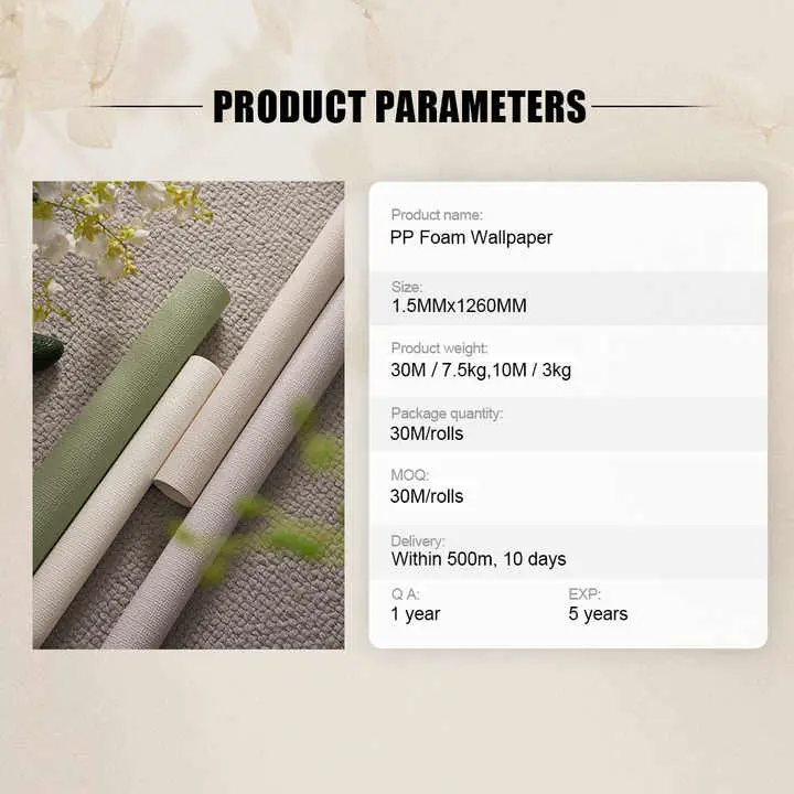 · Daŭra kaj akvorezista materialo: Nia PP-ŝaŭma tapeto estas farita el altkvalita polipropilena materialo, certigante, ke ĝi restas humideca, akvorezista, kaj imuna al muldilo kaj varmego, igante ĝin perfekta por uzi en diversaj medioj, inkluzive de hejmaj, komercaj kaj administraj spacoj.